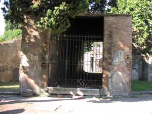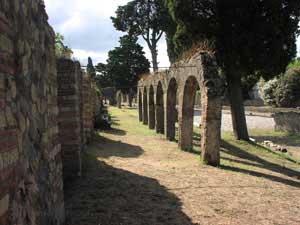 A number of features immediately suggest that this area is of great significance to an understanding of the via Consolare/via dei Sepolcri axis that coordinates the Project's goals. As has already been noted above,the general area of the Villa delle Colonne a mosaico contains a variety of building types in the final phase including a row of fourteen shops with retrobotteghe and a arcaded frontage running along the approximately 180m from where the road begins to widen into a large triangular expanse until it forks into two separate ways; one continuing in a roughly north-west direction, presumably eventually to Herculaneum, and the other, the so-called via Superior whose course can be traced at least as far as the Villa dei Misteri where it passes into a covered front entrance and seems to continue further to the north. The underlying topography of the area slopes dramatically from the west to the east and from the south to the north so that a change of more than 4m in elevation is visible from the lower parts of the Villa delle Colonne a mosaico to the upper floors and terrace, much of which lies outside the excavated area of the site. Indeed, the change of elevation is so significant that at the top of the hill, parts of the the Villa were seemingly buried under less than a metre of volcanic materials during the eruption. The Villa made use of this high underlying ground to build a dramatic portico and vista point which even today presents a commanding view of the via dei Sepolcri, the Porta Ercolano and the entire Bay of Naples, especially southward towards Sorrento and the Monti Lattari. Nestled partially within the hillside, the row of 14 shops makes use of the natural topography and also structurally supported the upper stories of the Villa. In fact, the two are so integrated that parallels could be drawn between this arrangement and the appearance of the caseggiati of Ostia in which the lower shops were occasionally located under relatively luxurious living accommodations that had many features in common with this villa, but were located deep in the urban environment. The villa, situated atop its pedestal of shops and pergulae, was the most visible and remarkable monument one would witness as one approached the city from the north. Such attention to presentation is echoed in the work lavished upon the rebuilt Porta Ercolano such that it appeared to be a triple triumphal arch that was quite possibly even adorned with statuary, indicating the importance that the road had for the city. ![]() |