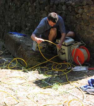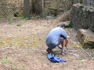 In 2006, Electrical Resistivity Tomography was utilized through the generous availability of Gianfranco Morelli and Federico Fischanger of Geoastier S.r.l., and produced resounding results. The research made use of an IRIS Syscal Pro Resistivity Meter which has 72 separate electrodes spaced at even intervals down a long cable. Measurements made along this cable are received on 10 channels and allow for the line of the cable to be measured in many thousands of combinations in only a few minutes. This procedure, which is called a ‘pseudo-section’ presents a type of analysis and results which differ from those produced via standard resistivity. Rather than producing a plan of the subsurface stratigraphy, the results take the form of a ‘section view’ through the deposits under its array, as if the soils had been sliced through and offering the opportunity to measure the approximate depth of the anomalies it encounters, in this instance up to 2.5m below the surface. In addition to long sections, the IRIS Syscal Pro can be set up as a grid with the long cable running back and forth across the area. This produces a number of closely spaced transect sections which can be interpolated to produce a plan view of the subsurface features. However, more than a simple two dimensional picture from above, this plan view, like the sections mentioned above, also contains information on the subsurface stratigraphy at depth. A total of nine 12m long transects were conducted in three separate zones of the area of the Villa delle Colonne a mosaico. One set of four transects were conducted in the long stretch of grass-covered soils in front of the western shops that line the via dei Sepolcri. The area measures approximately 8-10m wide between shop front and road. The transects were aligned in a manner that recorded both the front room of the shop, the arcade front, and downward sloping area between the colonnade and stone paved street. The second venue included two areas inside the house: the open ‘courtyard’ of the colonnade and the viridarium of the mosaic columns. Within this area three 12m transects were conducted. Two were aligned parallel to each other and perpendicular/tangential to the third. The final area was located in a trapezoidal space defined by high walls directly behind the prominent tombs aligned on the avenue to the south of the Villa proper. Today this space is characterised by several large trees and large amounts of rubble debris. ![]() |