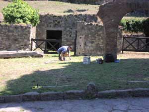 Research in 2005 and 2006 The research conducted during the summers of 2005 and 2006 was undertaken in conjunction with the current excavation activities of the Bradford Exacavations in Insula VI.1 (AAPP). The focus of the Project's research during these seasons was the area of the Villa delle Colonne a mosaico. Situated in the extreme northwest of the excavated extent of the city of Pompeii, between the Porta Ercolano and the Villa dei Misteri, the area of the Villa delle Colonne a mosaico and its associated shops was one of the early areas of the city to be cleared and at one time received a great deal of interest as is attested by the large number of etchings and watercolours by early visitors to the city in the 18th and 19th centuries. Indeed, the vista across the tombs to the ancient Porta Ercolano was one of their most frequently treated subjects. However, more recently the area has often been overlooked as a component of the ancient site, perhaps because of its location outside of the city wall. Indeed, L. Eschebach’s Gebaudeverzeichnis (1993) does not include the roughly 4000m2 sized area within its otherwise comprehensive scope. The area received its most extensive recent study as a component of the work of V. Kockel on the tombs of the via Sepolchri (1983). He noted that whilst he could complete an interpretation of the relative sequence of structures, in the absence of stratigraphic excavation and securely dates finds, absolute dating was not possible. The pavement area on the north side of the block has also been excavated between the Porta Ercolano and doorway 12 north, the closest entrance to the Villa. ![]() |